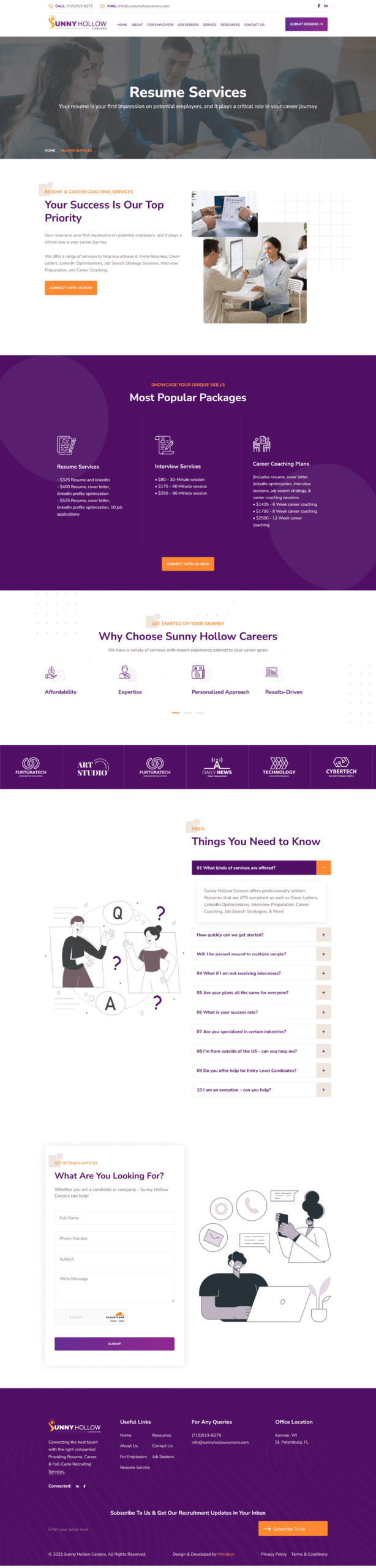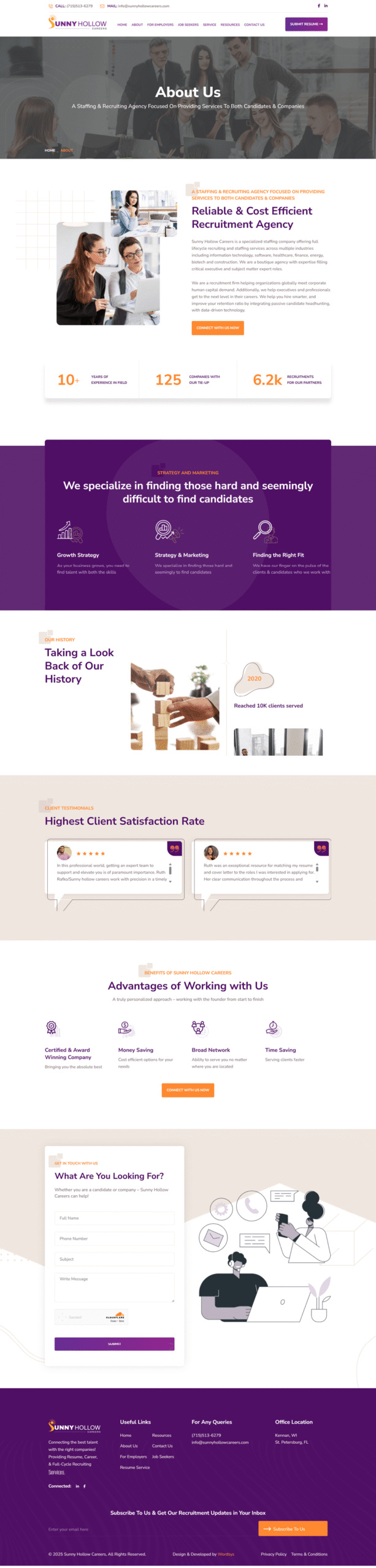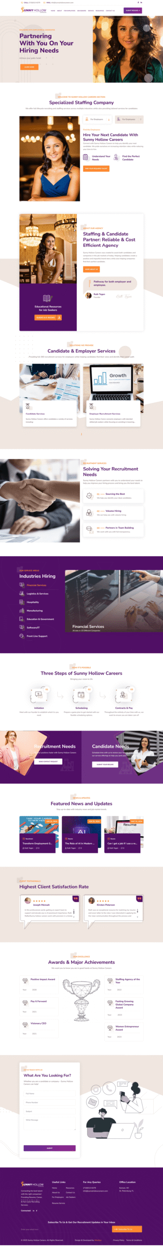 Sunny Hollow Careers features a modern, responsive, and fast WordPress site with ACF integration. SEO-friendly business portfolio designed to attract talent and showcase career opportunities.