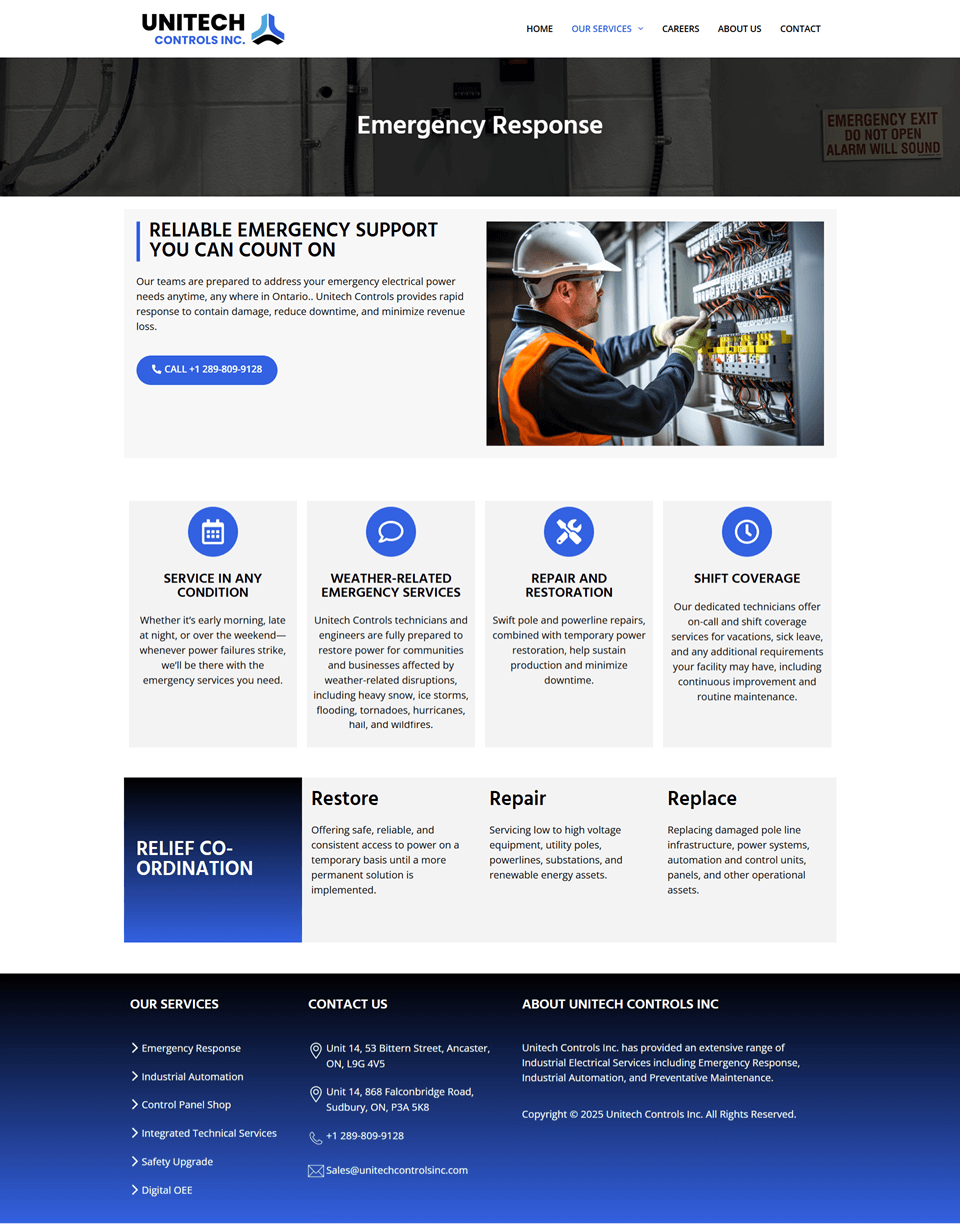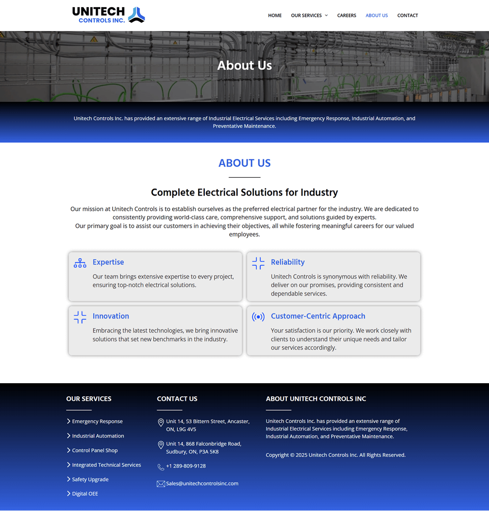Unitech Controls Inc. features a modern, responsive, and SEO-friendly business portfolio built with Elementor on WordPress. Fast-loading design showcases industrial solutions across all devices.