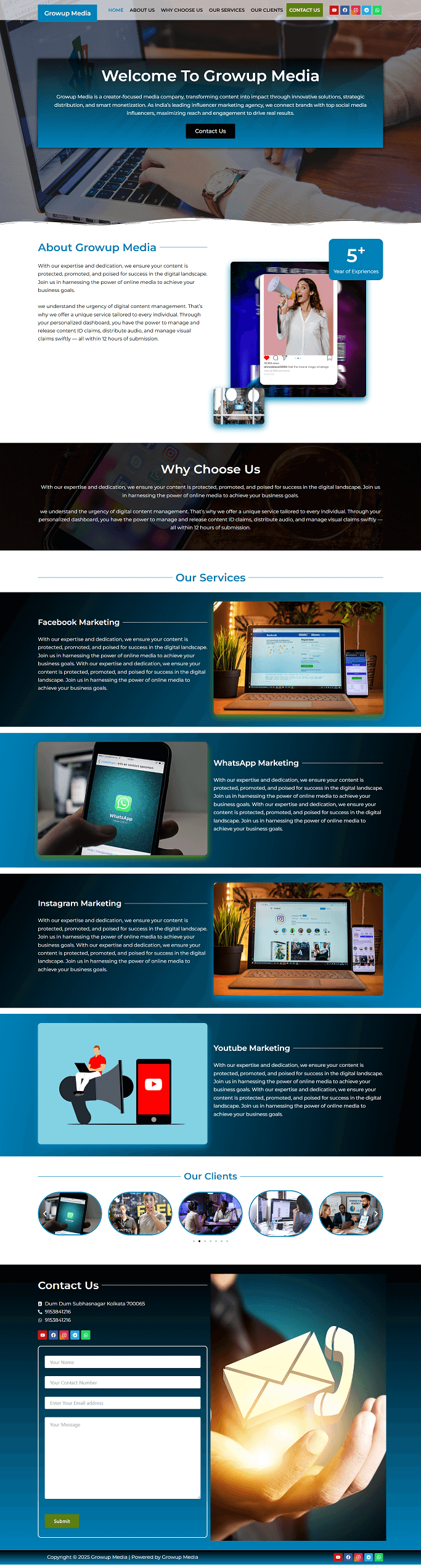 Growup Media is a modern, responsive, fast, and SEO-friendly WordPress business portfolio built with Elementor, Contact Form 7, and WhatsApp Chat for seamless communication and professional impact.